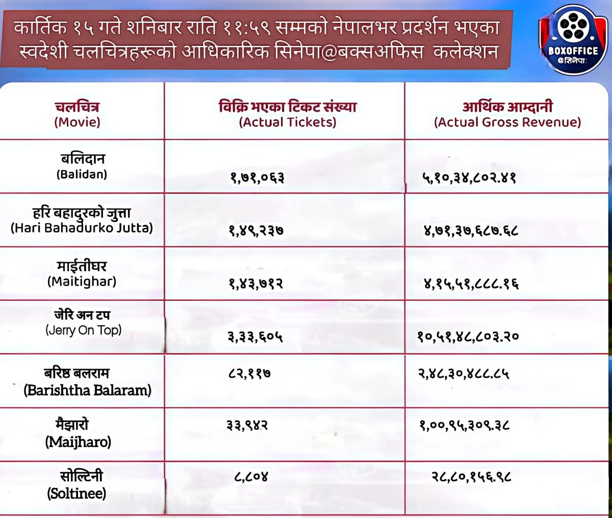 कात्तिक २५ गते शनिबार राति ११:५९ सम्म नेपालभर प्रदर्शन भएका स्वदेशी चलचित्रहरूको आधिकारिक बक्स अफिस रिपोर्ट सार्वजनिक भएको छ।